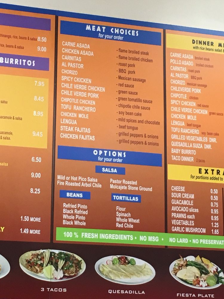 Choice of meat, beans, cheese, guacamole, sour cream, lettuce, tomato, and salsa. Make it a dinner by adding rice, beans, salad, and tortillas